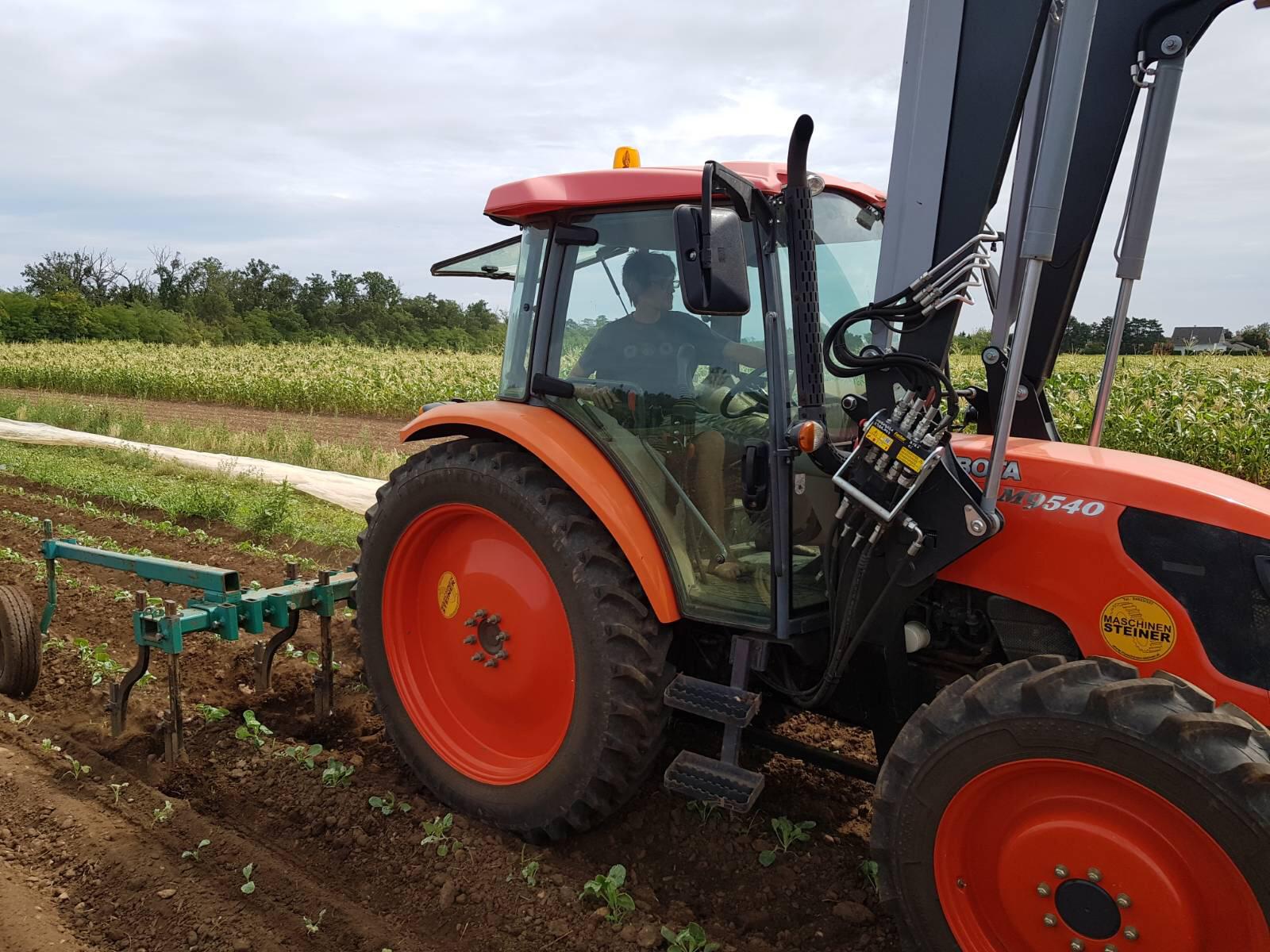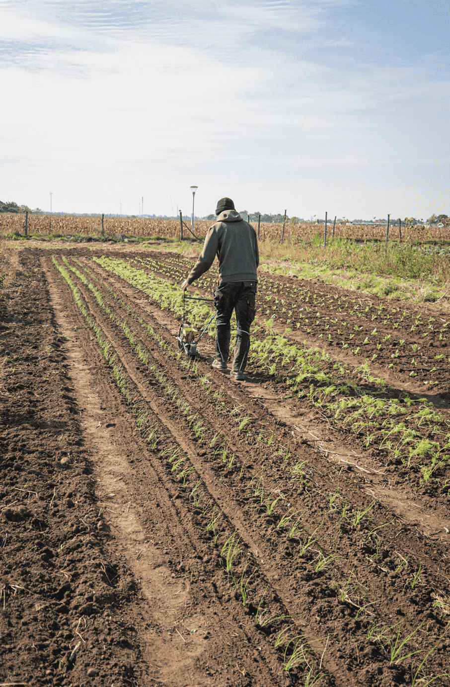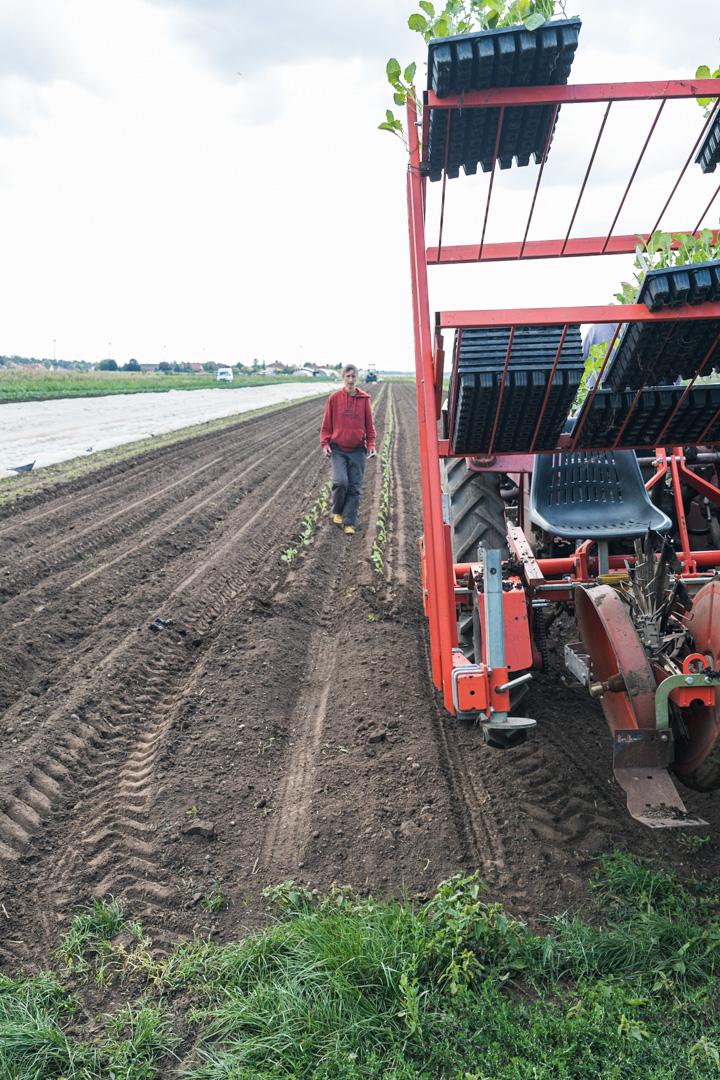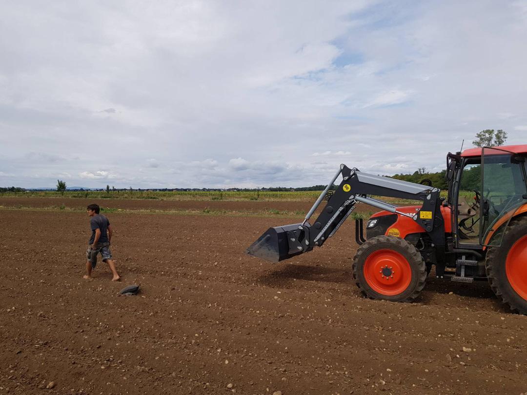 Luca mit der Sähmaschine. Bald steht hier der Schiebetunnel.