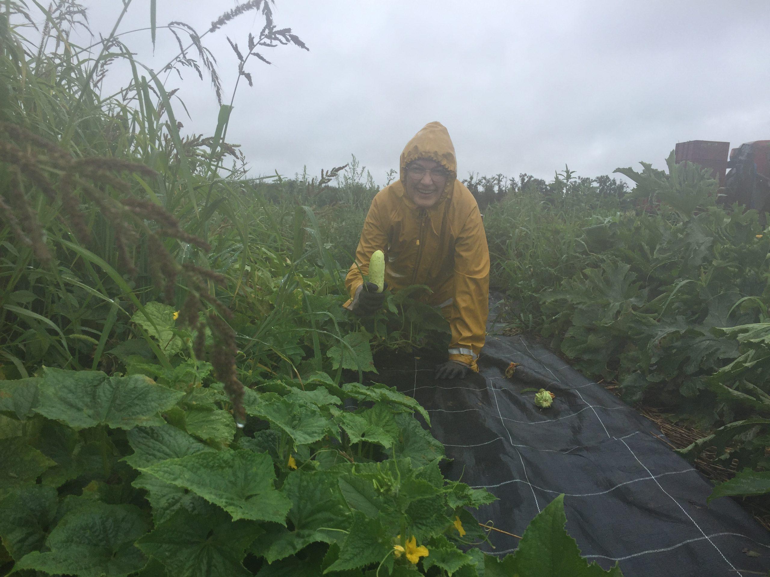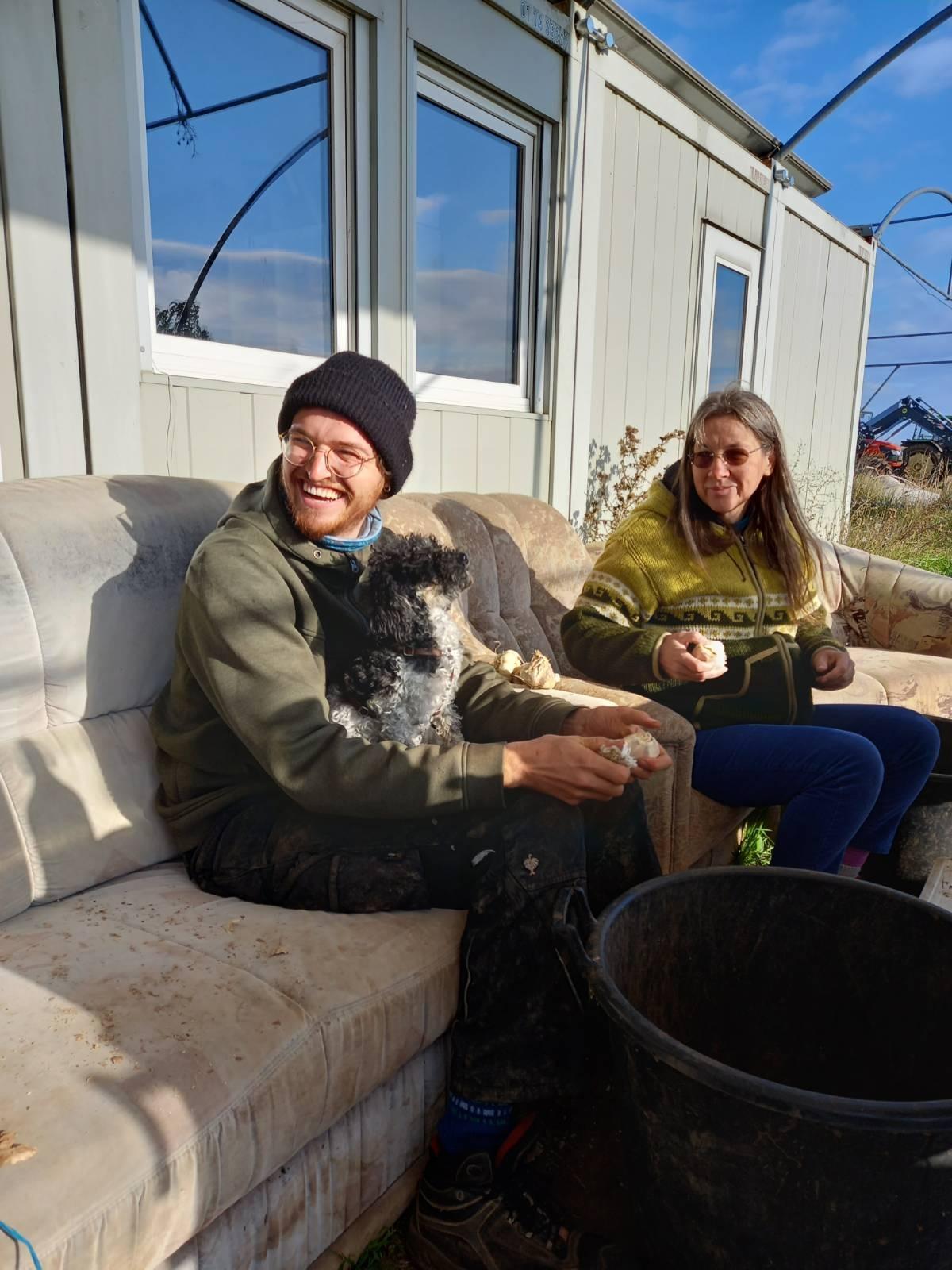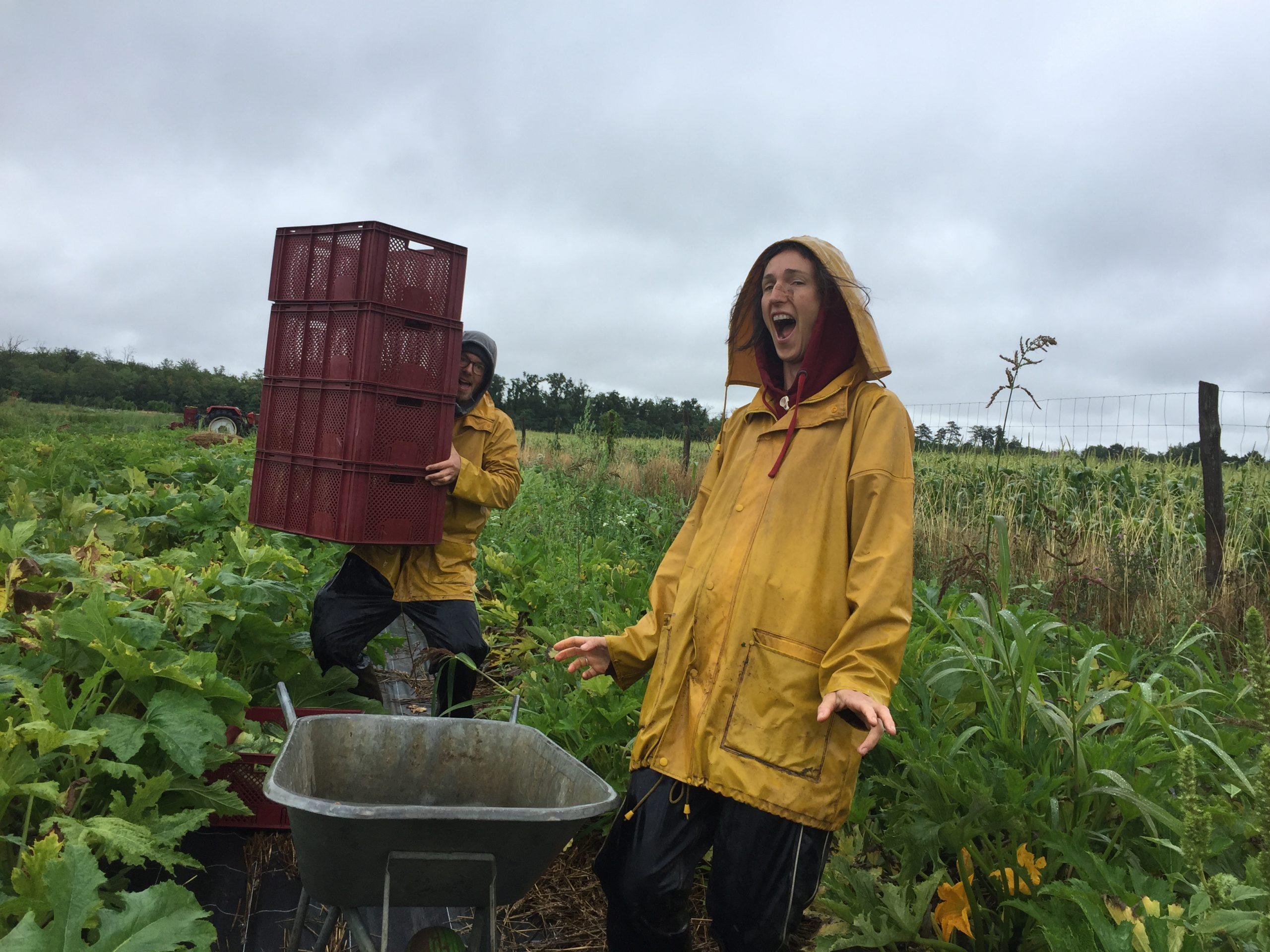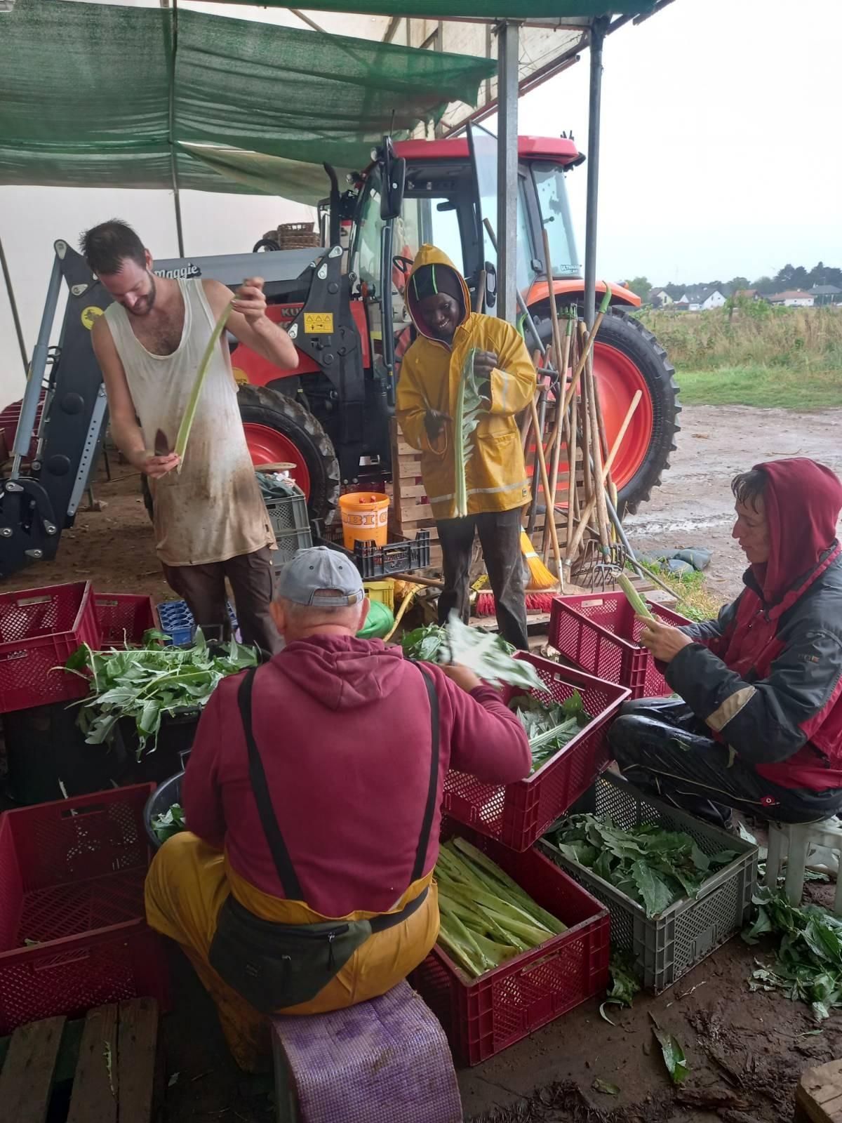 Hier zwei gut verpackte Mitglieder des Donnerstags-Ernte-Teams, das auch an regnerischen Feiertagen für uns da ist. Danke!