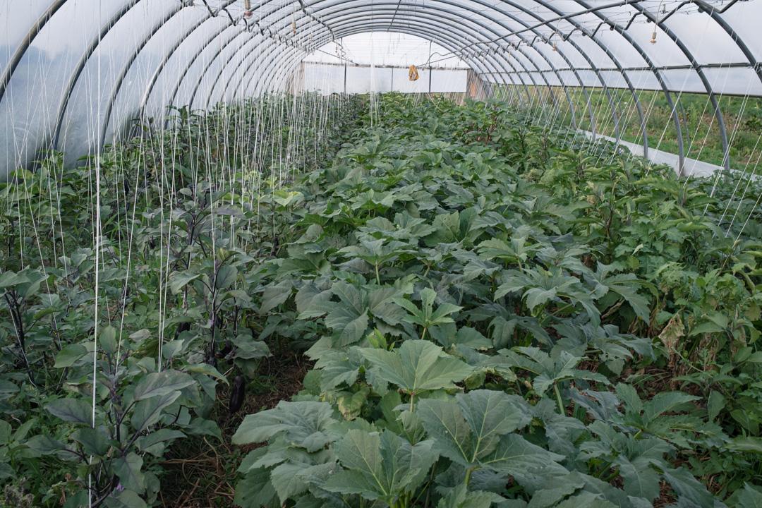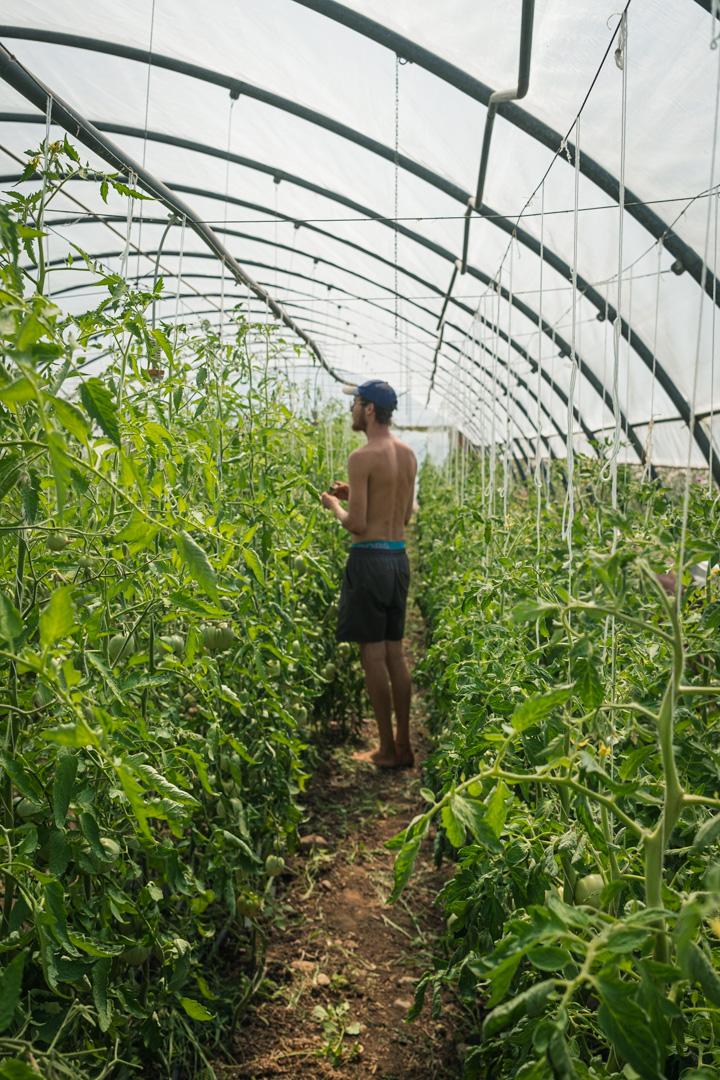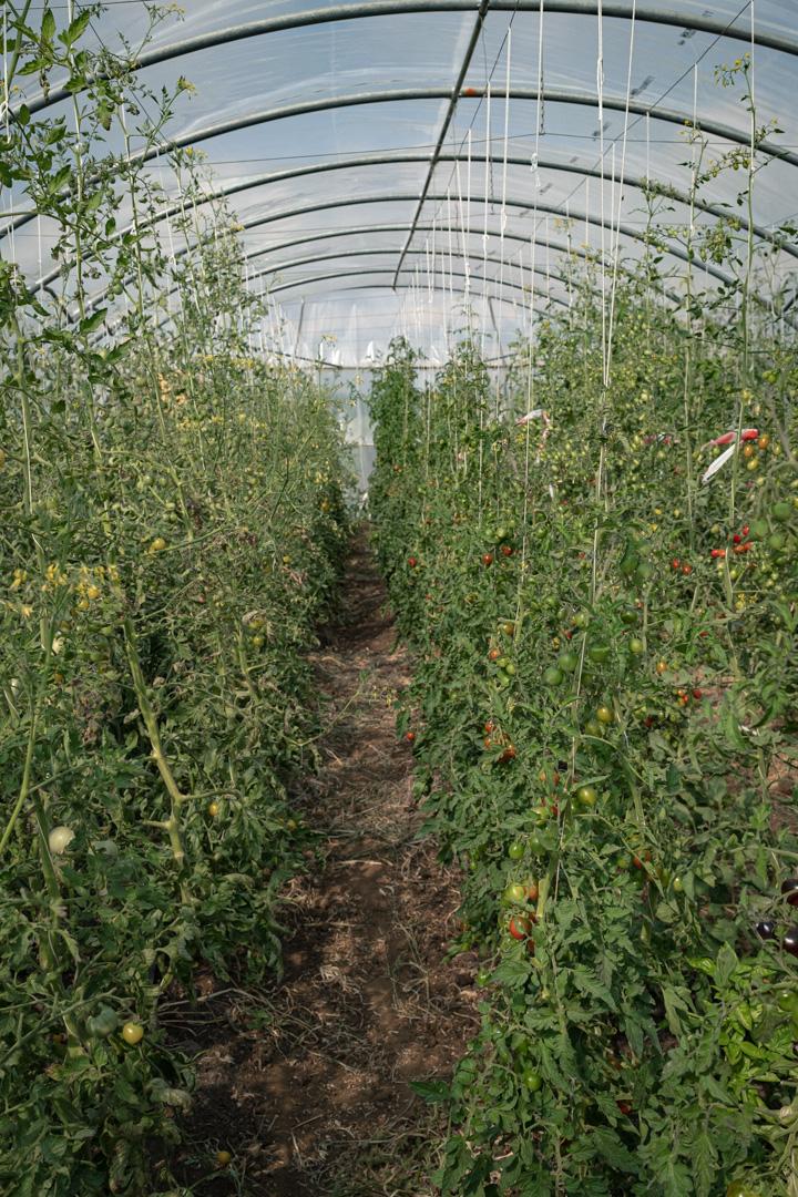 Tobi und Christoph haben den Tunnel fertig mit Paradeisern bepflanzt. Die Tröpfchenbewässerung liegt auch schon