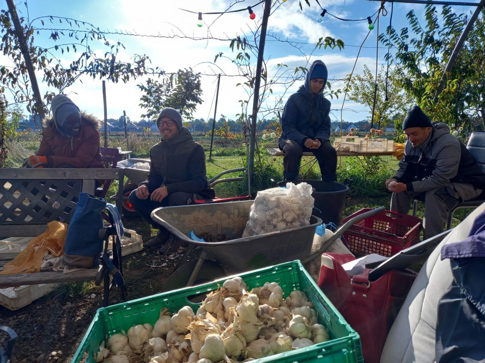Das Team beim Knoblauch fürs Stecken Vorbereiten