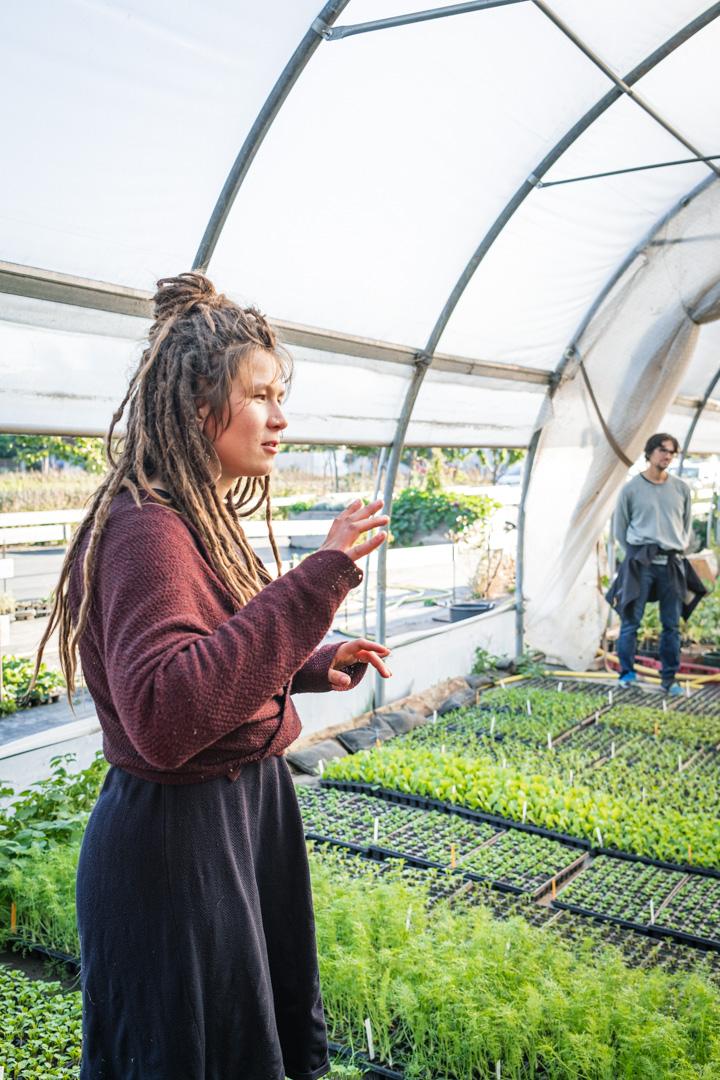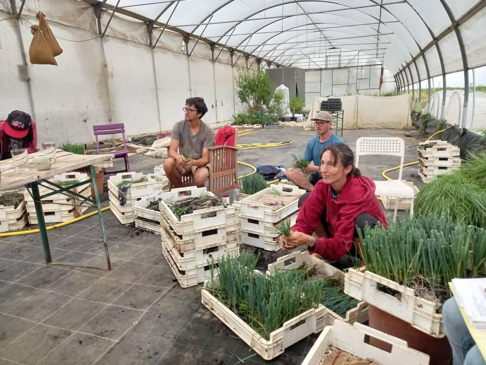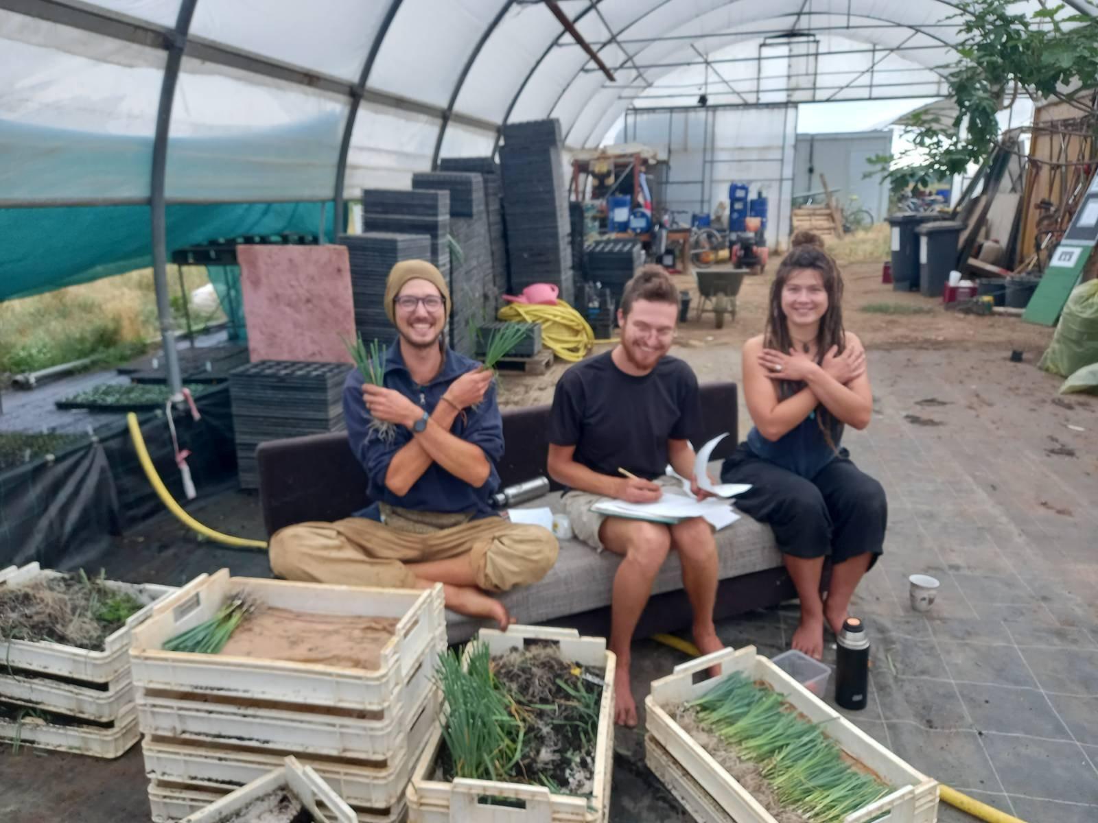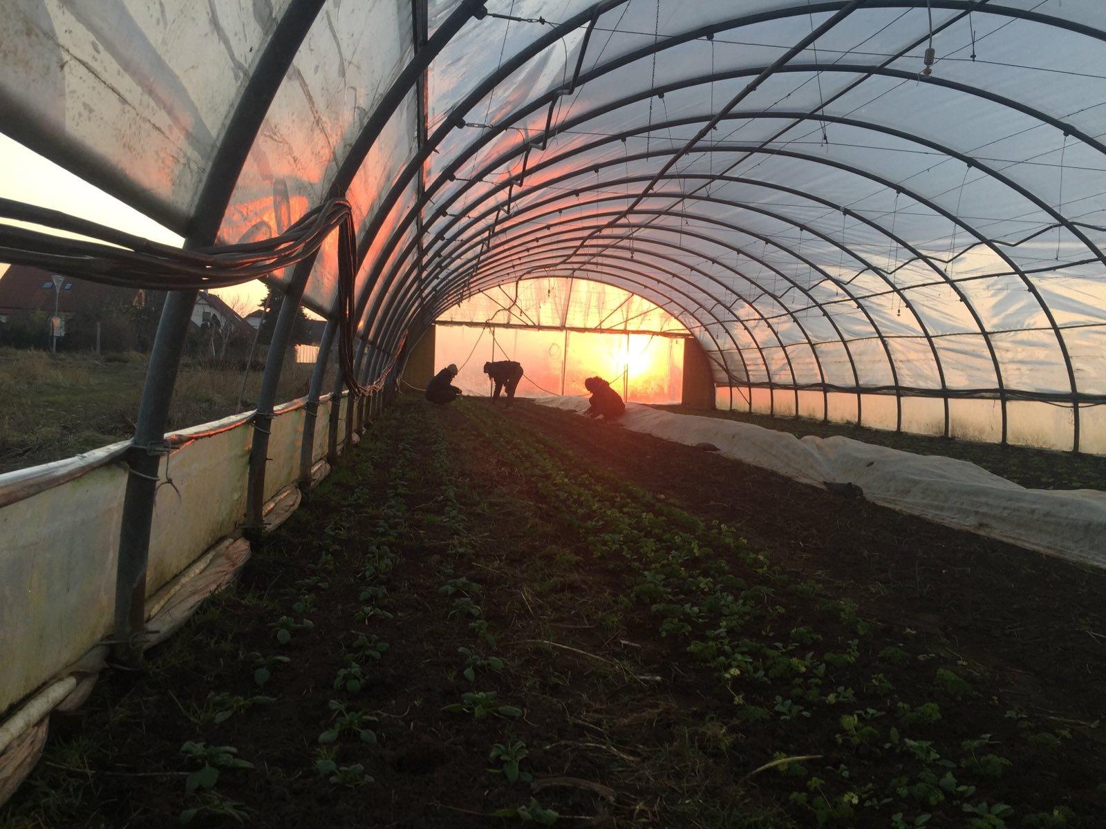 Rosi, Ebrima und Tobi gestern beim Setzen vom Vogerlsalat im Tunnel.