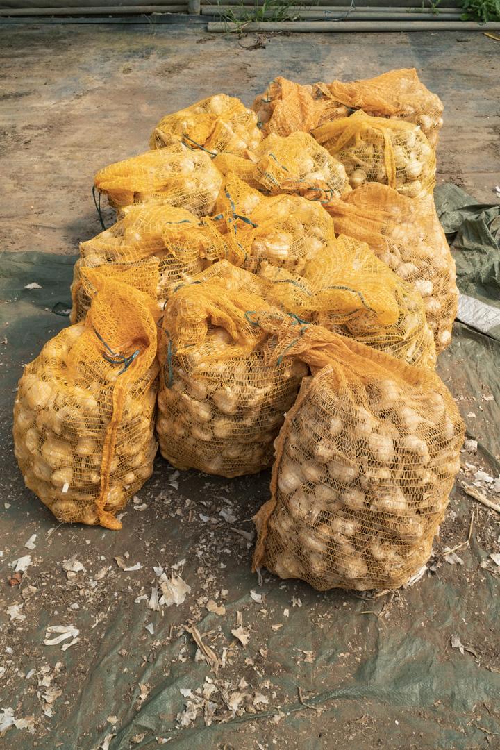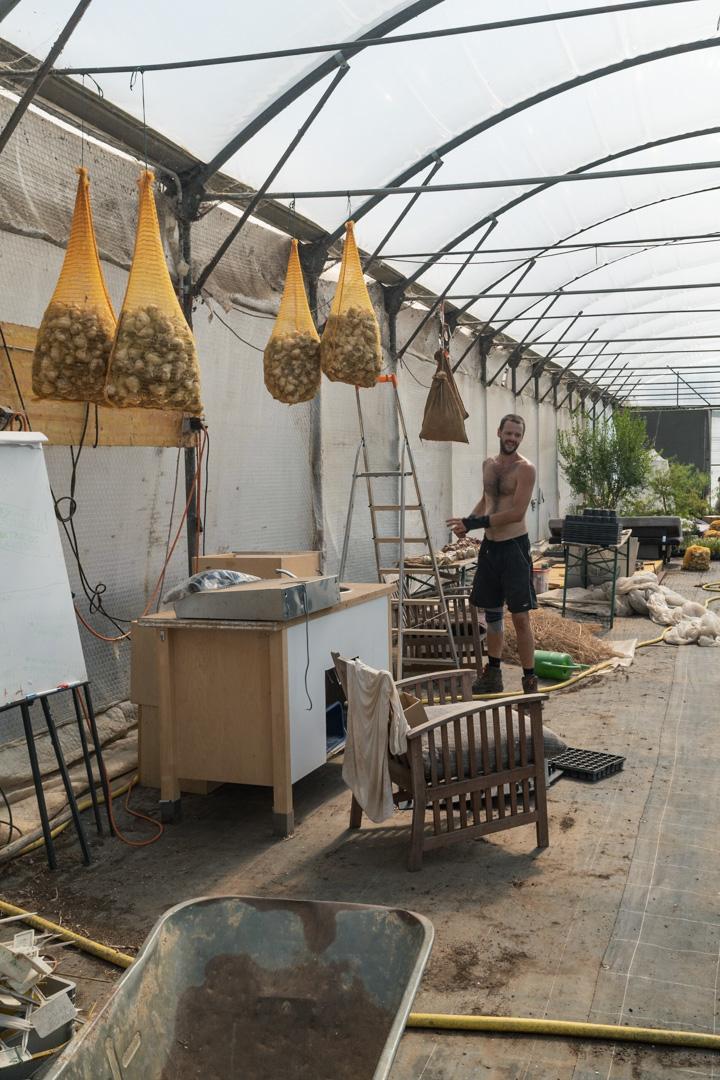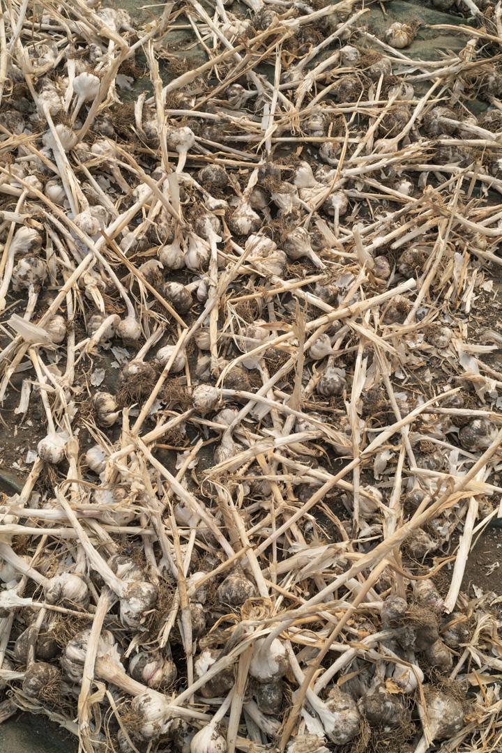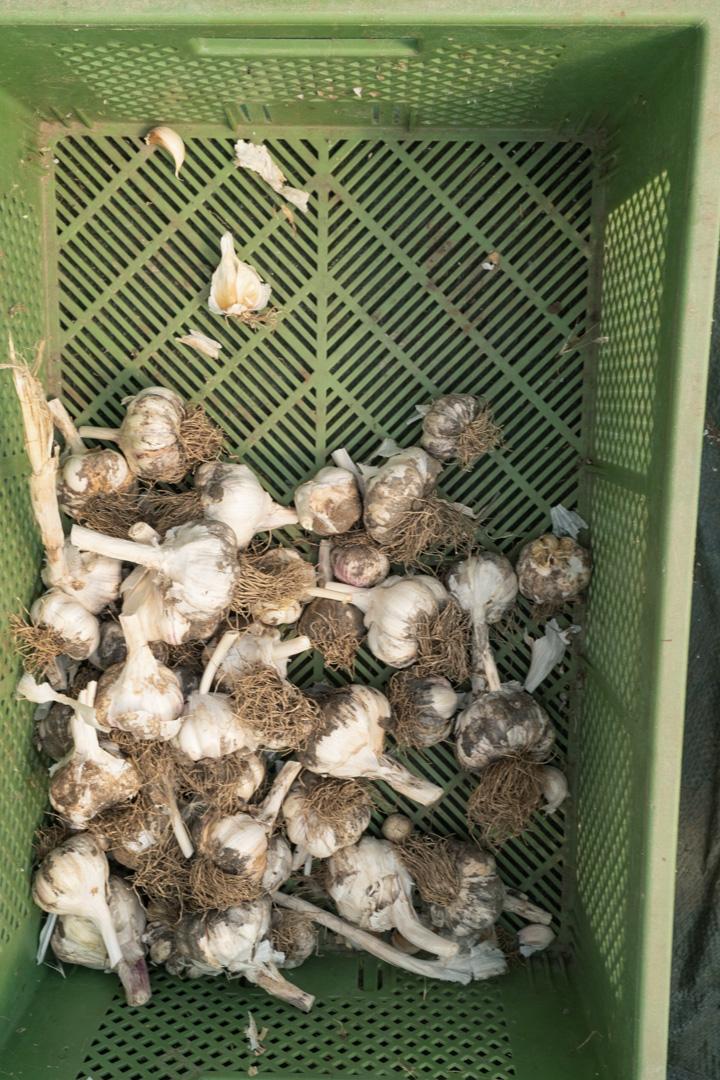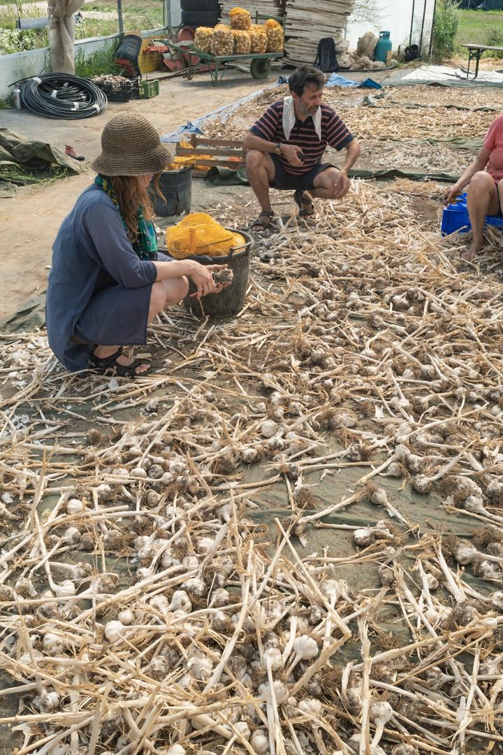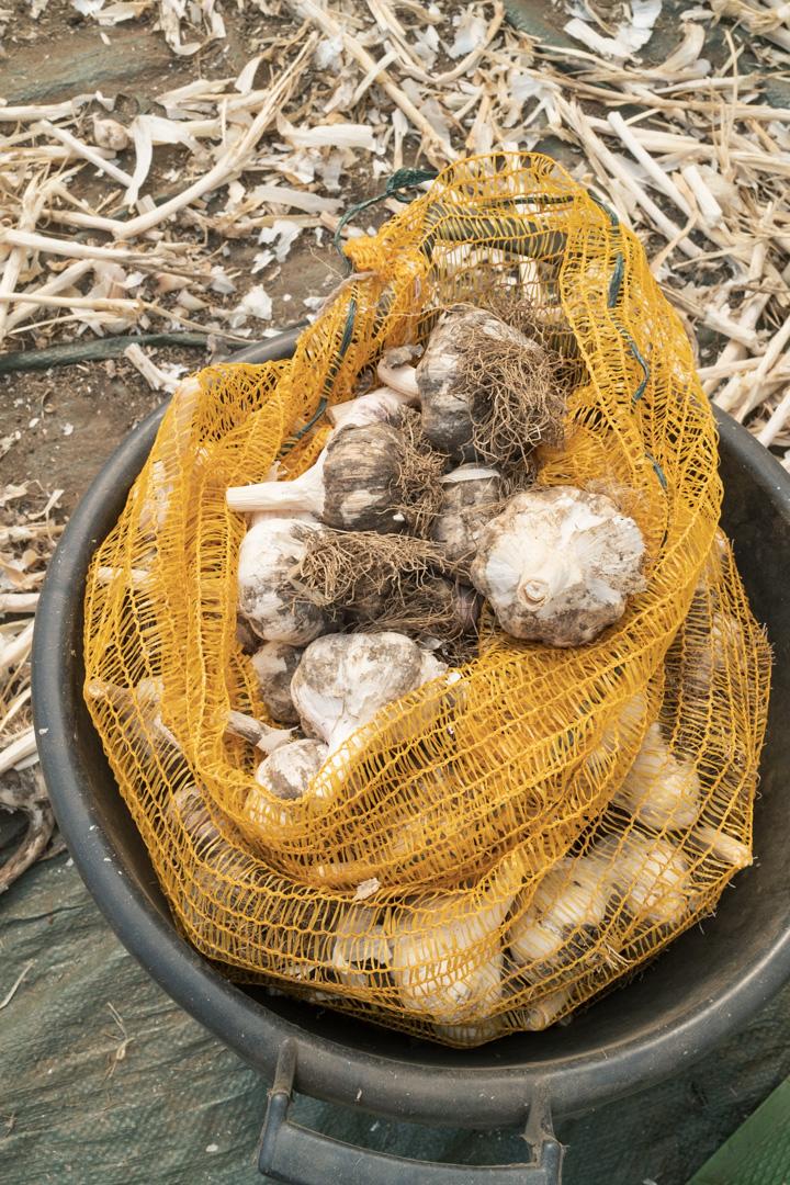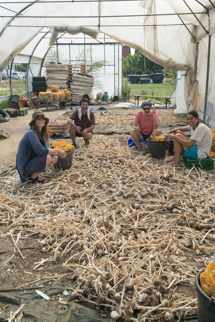 Der Knoblauch lag zum trocknen im Tunnel, dort mussten dann noch die Stiele abgeschnitten werden und je ca. 200 Stk in einen Sack verfrachtet. Das alles bei ca. 50° im Tunnel.