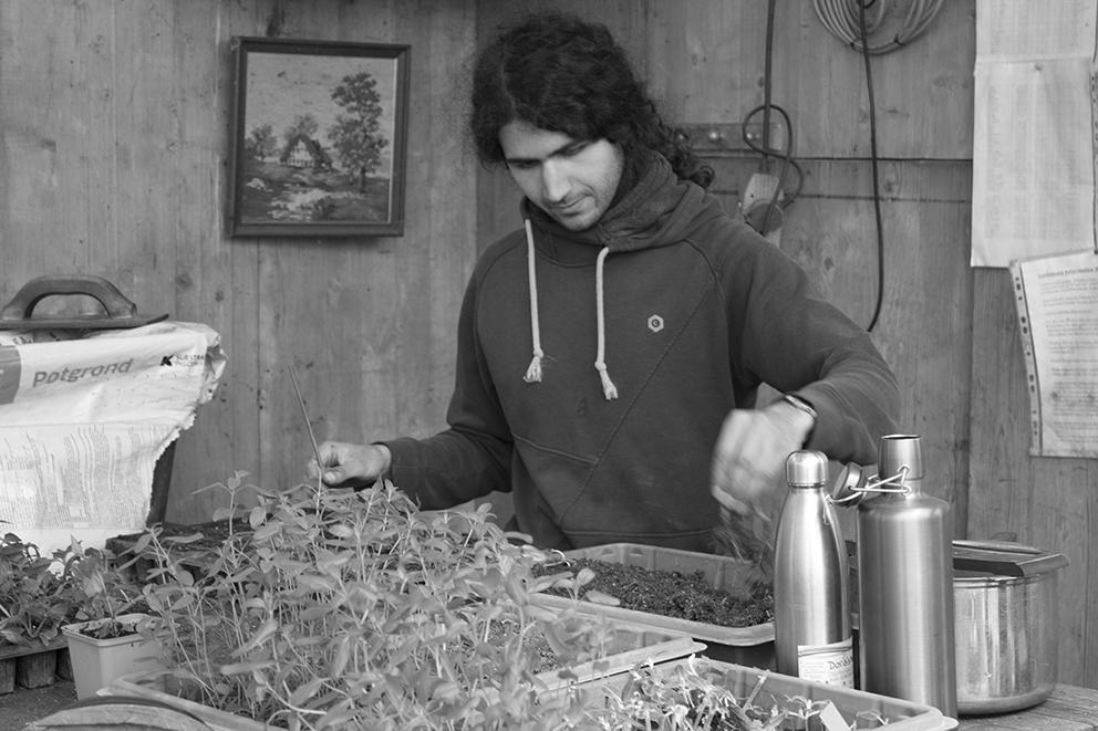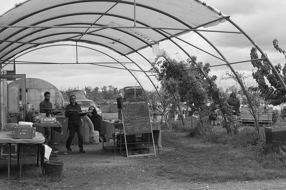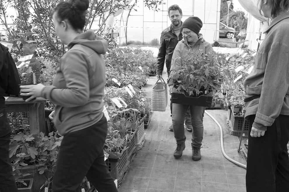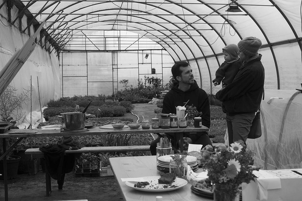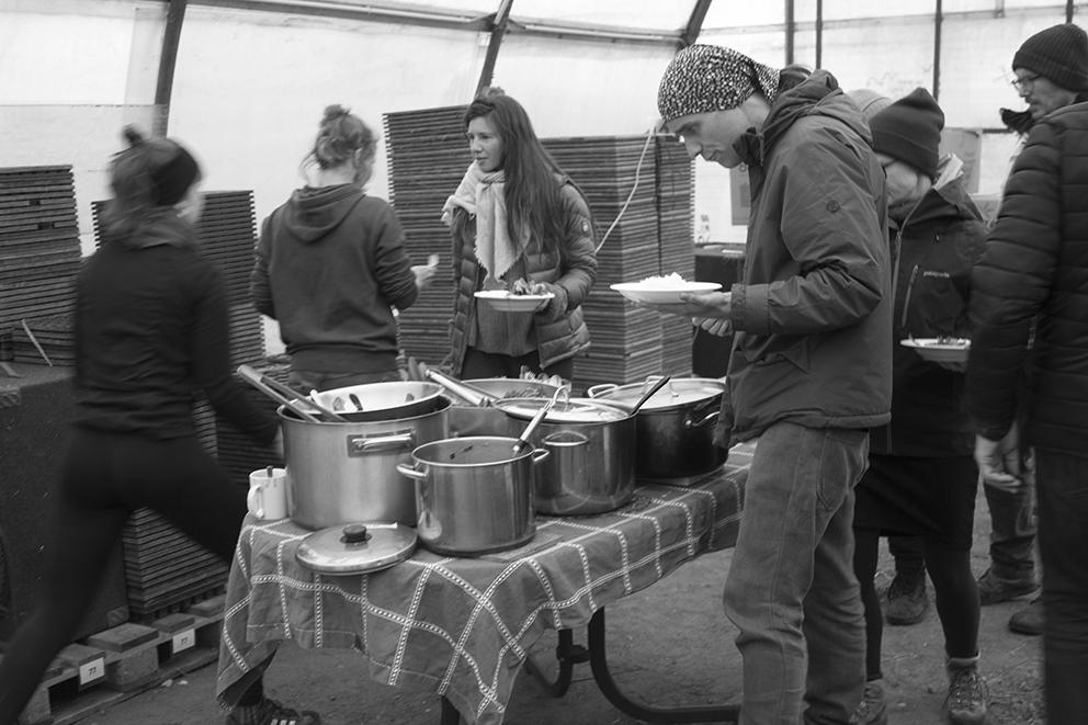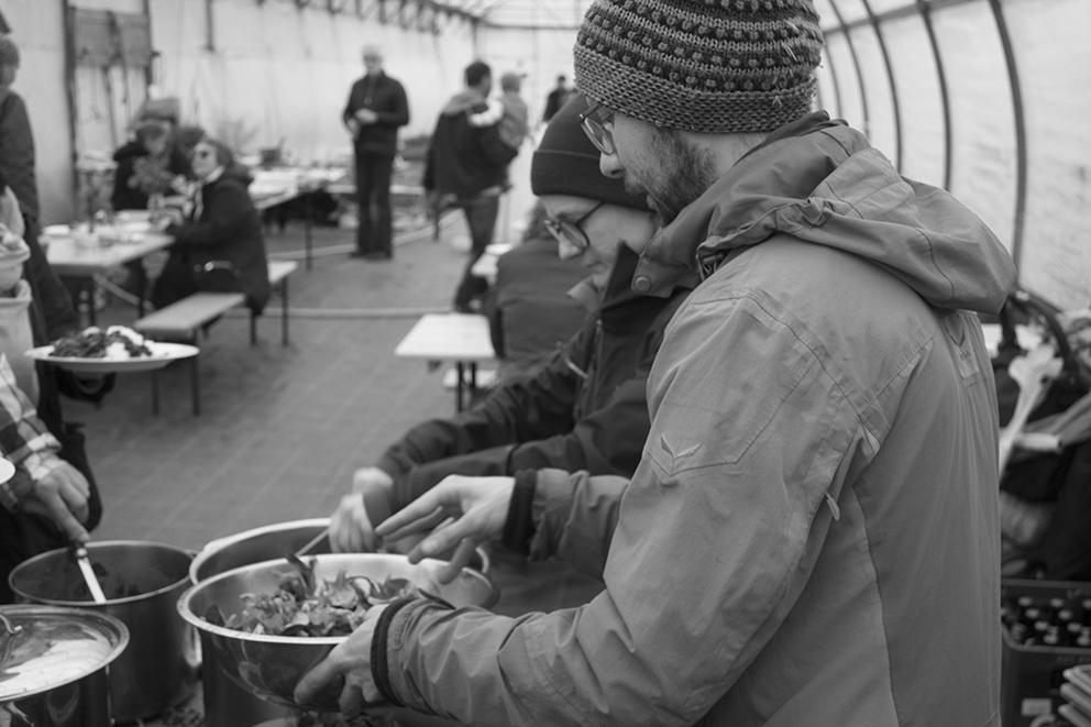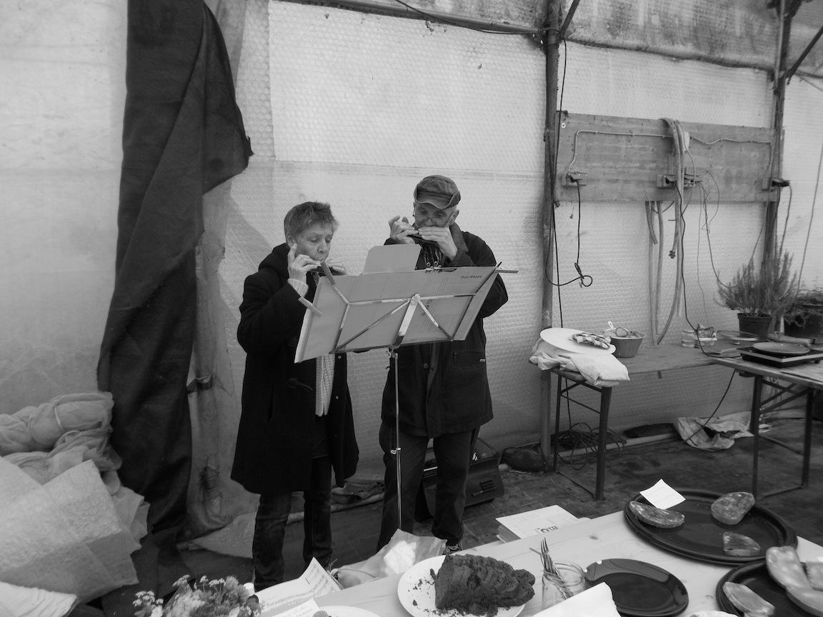 Im Schutz des Jungpflanzentunnels war’s sogar angenehm warm. Nebenan wurden fleißig Pflänzchen verkauft, während wir mit Untermalung von Eva und Rudi auf der Mundharmonika plauderten, mitgebrachte Kuchen und Aufstrichbrote und zu Mittag Georgy’s köstliches Kichererbsen-Curry genossen. Da Willi in die wohlverdiente Palatschinken-Pension gegangen ist, haben Hannah und Inga vom Hofteam diesesmal die Pfanne geschwungen! Nur mit der veganen Version hat’s nicht so gut geklappt, ansonsten top! Falls jemand von den Mitgliedern bei den zukünftigen Festen diese ehrenvolle Aufgabe übernehmen möchte, bitte gerne bei uns melden!!