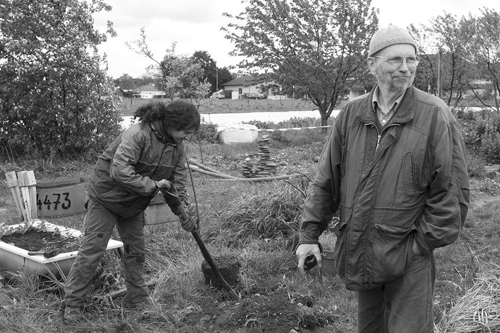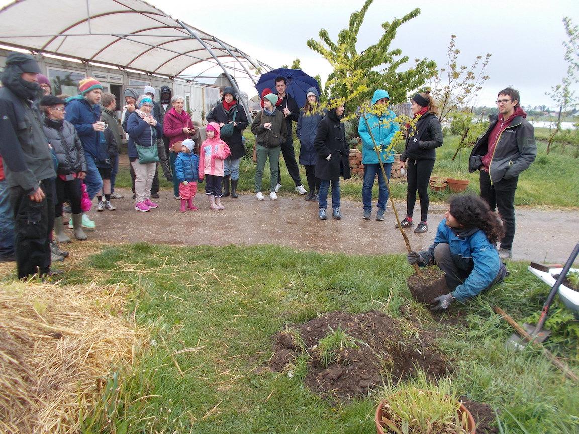 Als der Regen bisschen nachließ, wurde wie schon im letzten Jahr gemeinsam ein Baum gesetzt: ein Osagedorn (auch als Milchorangenbaum bekannt – Maclura Pomifera). Dieser hat Dornen, die Blüten stinken und die bis zu 1kg schweren Früchte (wenn er welche tragen würde) sind ungenießbar. Hoffentlich sieht er zumindest hübsch aus 😉